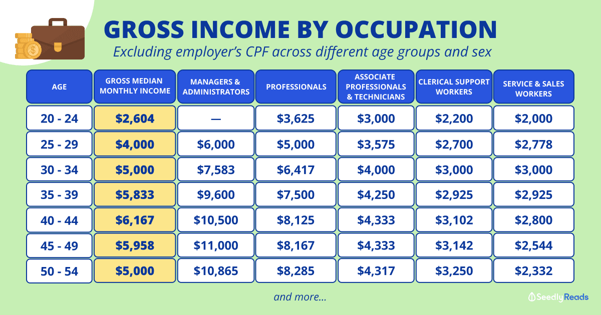 - The median gross income across all age groups and occupations is $4,550 (excluding employer CPF)