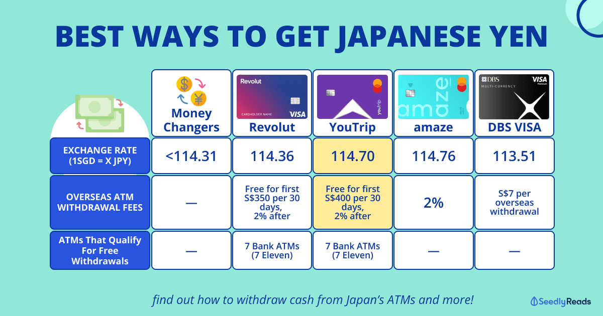 | YouTrip | 114.70 JPY | Free cash withdrawals of up to S$400 per calendar month, 2% thereafter | 7 Bank (7 Eleven) |