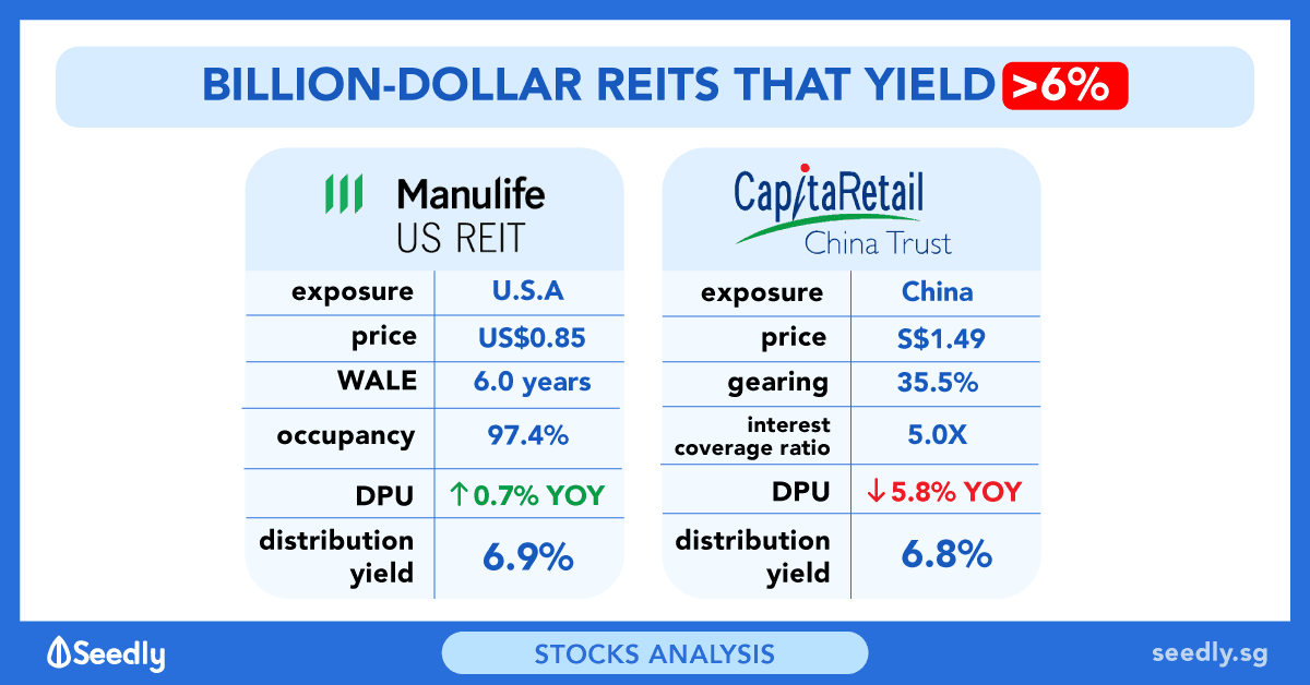 Although both have their individual challenges, it is up to investors whether they would prefer exposure to US commercial real estate (in the form of Manulife US REIT) or are more inclined to invest in Chinaβs retail scene (via CapitaLand Retail China Trust).