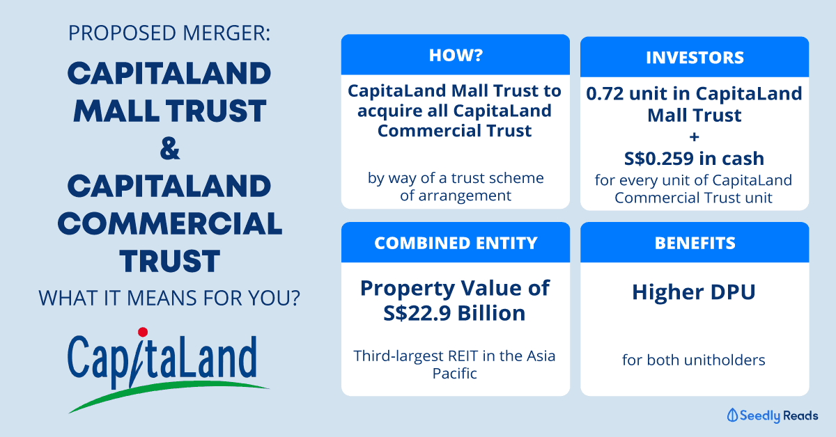 - There are many benefits to the merger, including higher distribution per unit for both CapitaLand Mall Trust and CapitaLand Commercial Trust unitholders, assuming the merger was completed by 31 December 2019.