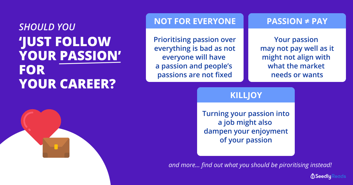 - Prioritising passion in your career over everything is problematic as not everyone has a passion and our passion would change over time.