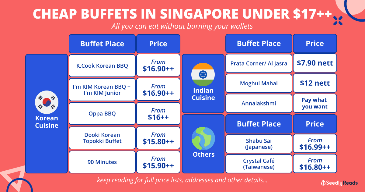 Here are some cheap buffets under $17++ ($20) that we have compiled and categorised based on the different types of cuisines.