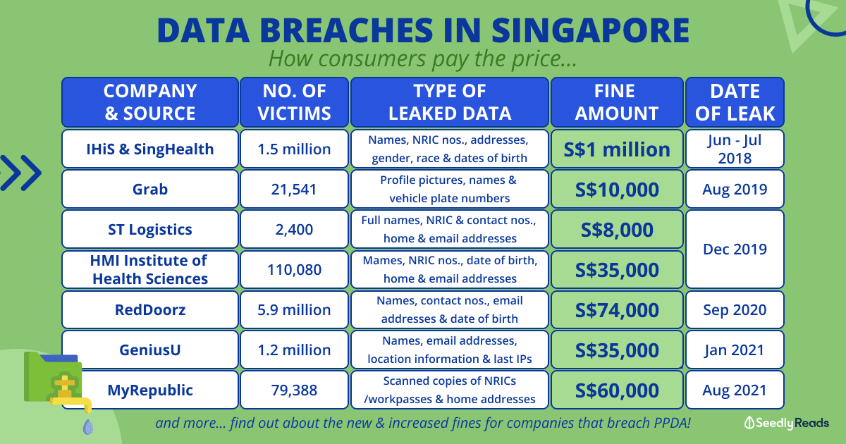 | Sources: ¹https://www.straitstimes.com/singapore/singapores-privacy-watchdog-fines-ihis-750000-singhealth-250000-for-data-breach ²https://www.straitstimes.com/tech/grab-fined-10000-for-fourth-data-privacy-breach-in-two-years ³https://www.todayonline.com/singapore/2-firms-fined-s43000-total-over-personal-data-breaches-affecting-mindef-saf-personnel ⁴https://www.businesstimes.com.sg/garage/data-breach-at-reddoorz-hit-6m-customers-hospitality-platform-fined-s74000 ⁵https://tnp.straitstimes.com/lifestyle/tech/edu-tech-firm-geniusu-fined-35000-data-leak-affecting-126m-users ⁶https://www.channelnewsasia.com/singapore/myrepublic-data-breach-nric-personal-information-2168531 |