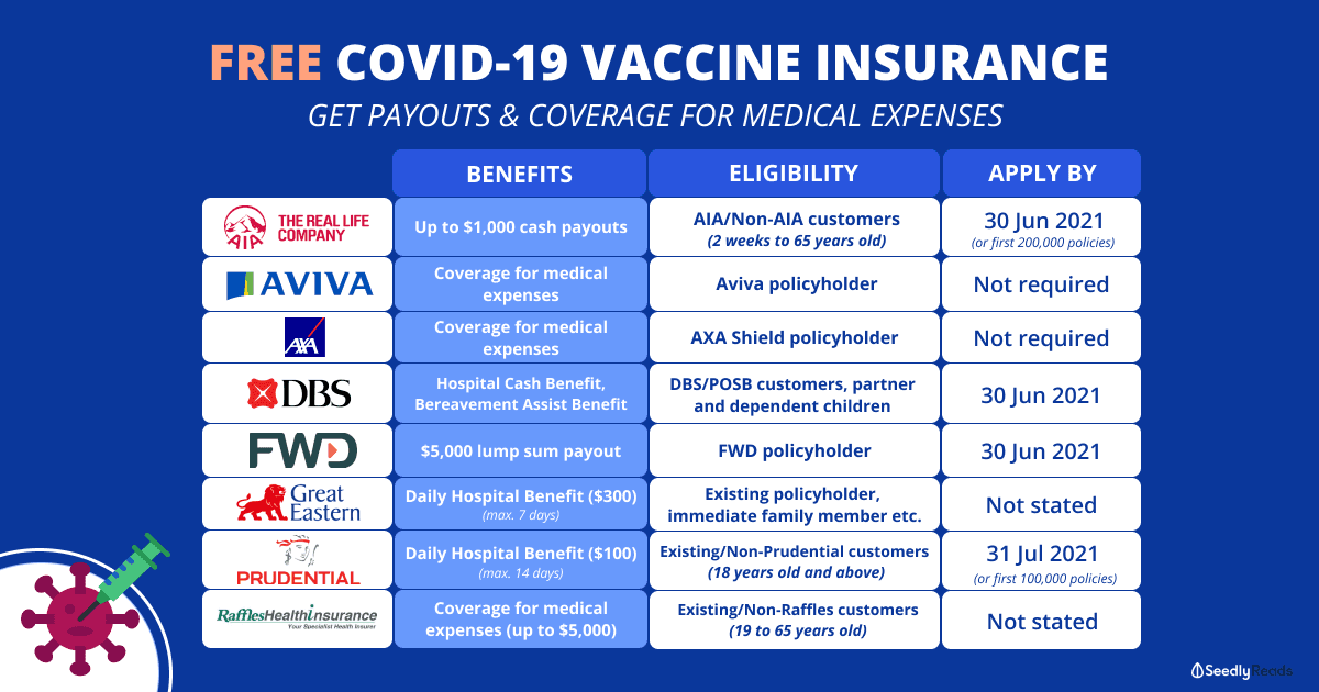 | Great Eastern | Daily Hospital Cash Benefit of $300 per day (max 7 days) | - Existing Great Eastern customer, an immediate family member or a recipient of an invitation from a Great Eastern Financial representative - Singaporean or Singapore Permanent Resident | 31 Dec 2021 or when an aggregate total of $1 million has been incurred by GREAT Vaccine Fund | Not stated |