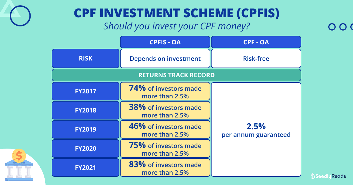 Basically, the returns for CPFIS-OA depend on how proficient you are as an investor whereas CPF OA will always give you risk-free interest of 2.5% per annum (p.a.).