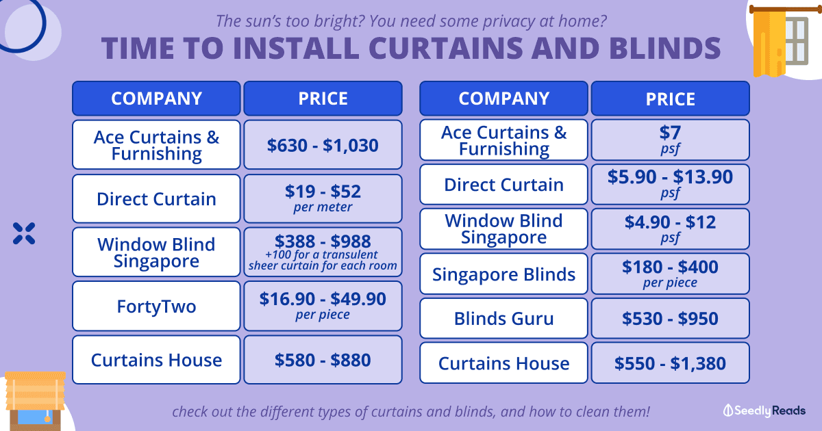 | Window Blind Singapore | $4.90 - $5.50 psf | N.A. | $5.00 to $8.90 psf | $12 psf |
