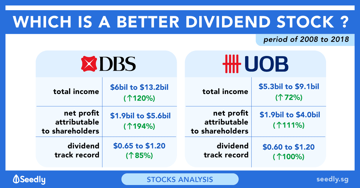 And now for UOB, it has grown its dividend per share from S$0.60 in 2008 to S$1.20 in 2018. In other words, its dividend was up by 100% during the period.