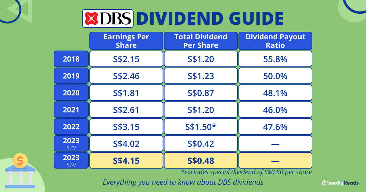 For the first half of 2023, DBS has given an interim dividend of S$0.42 in Q1 and will be giving an interim dividend of $0.48 in Q2.