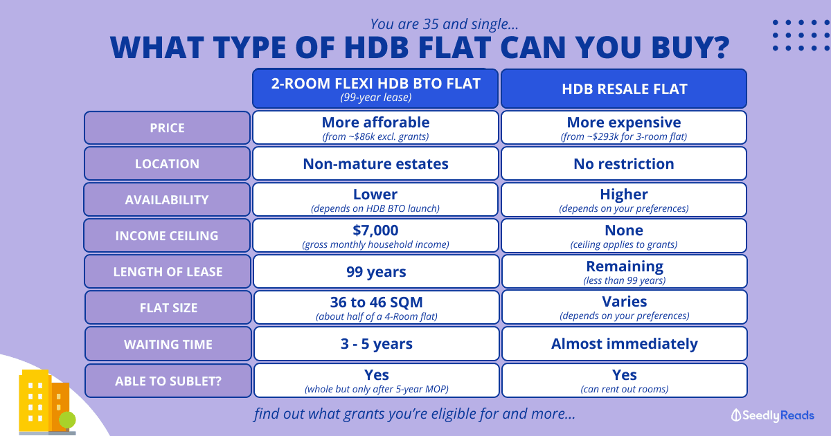 Assuming you’re a single, 35 years old Singapore citizen, you can buy a 2-Room Flexi HDB BTO flat in a non-mature estate.