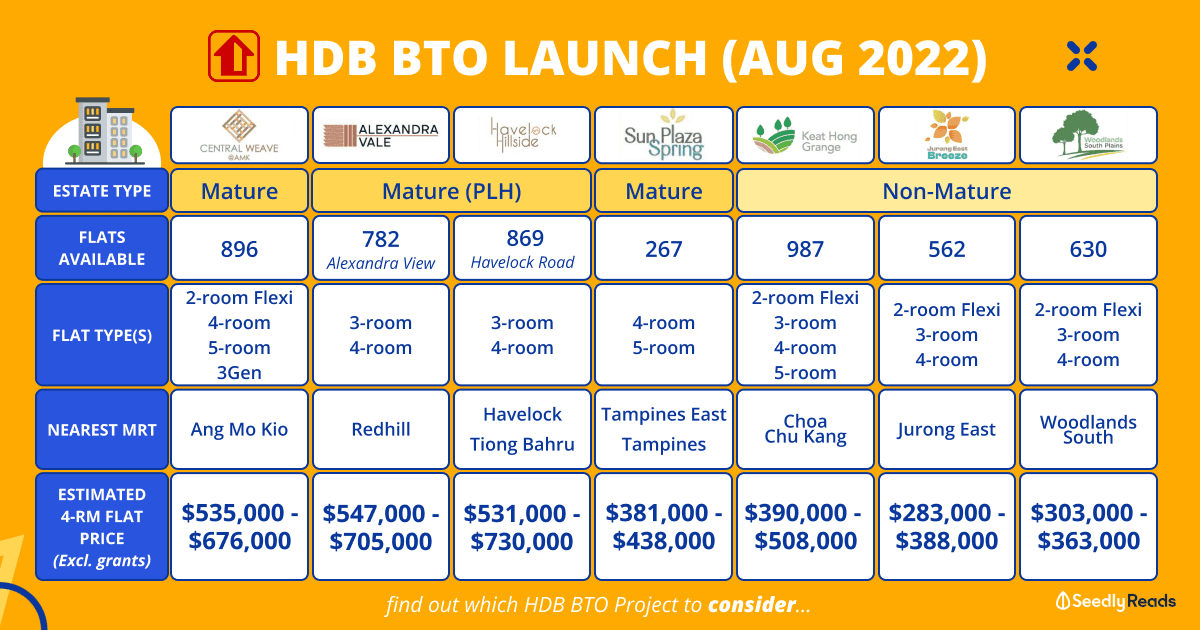 | HDB BTO August 2022 (Mature) | Central Weave @ Ang Mo Kio | Alexandra Vale @ Bukit Merah | Havelock Hillside @ Bukit Merah | Sun Plaza Spring @ Tampines |