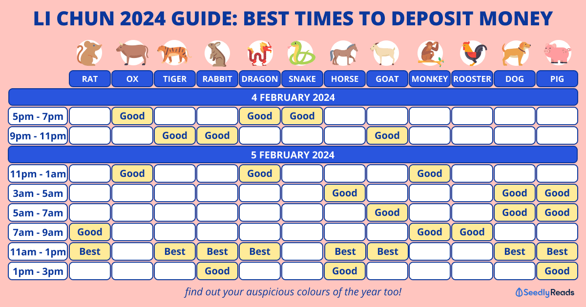 The most auspicious hours to deposit money are 11am – 1pm on 5 Feb 2024 for all the zodiacs, except Ox, Snake, Monkey and Rooster.
