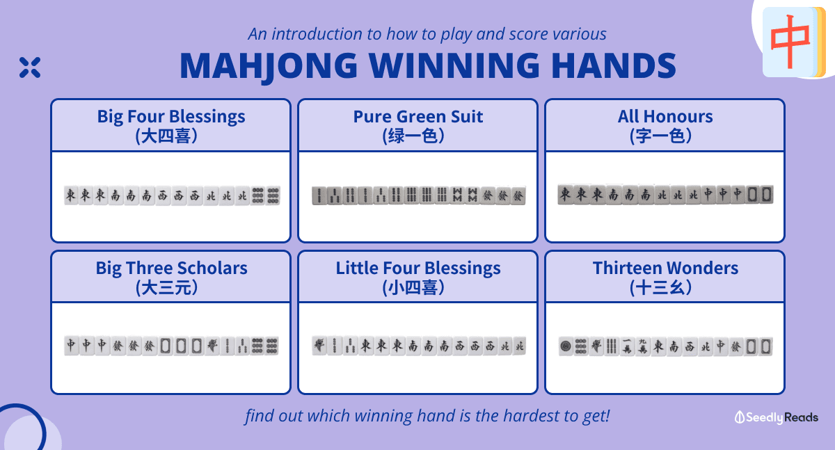 No prize for guessing, but the Big Four Winds/Big Four Blessings winning hand is said to have the lowest probability in a game of mahjong. With a rare 1 in 57,856 chance of happening, this combination must go onto your Instastory!