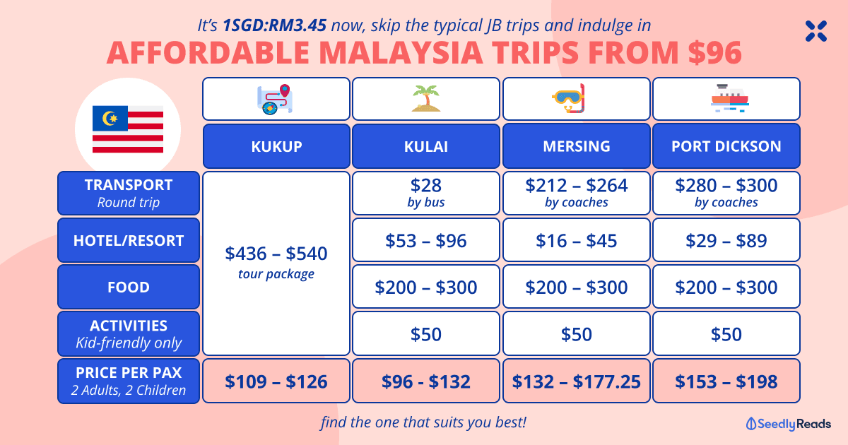 - Food expenses are excluded as they vary between destinations and are subject to changes. Except for Kukup, it’s advisable to factor in an additional $200 – $300 for 4 pax.