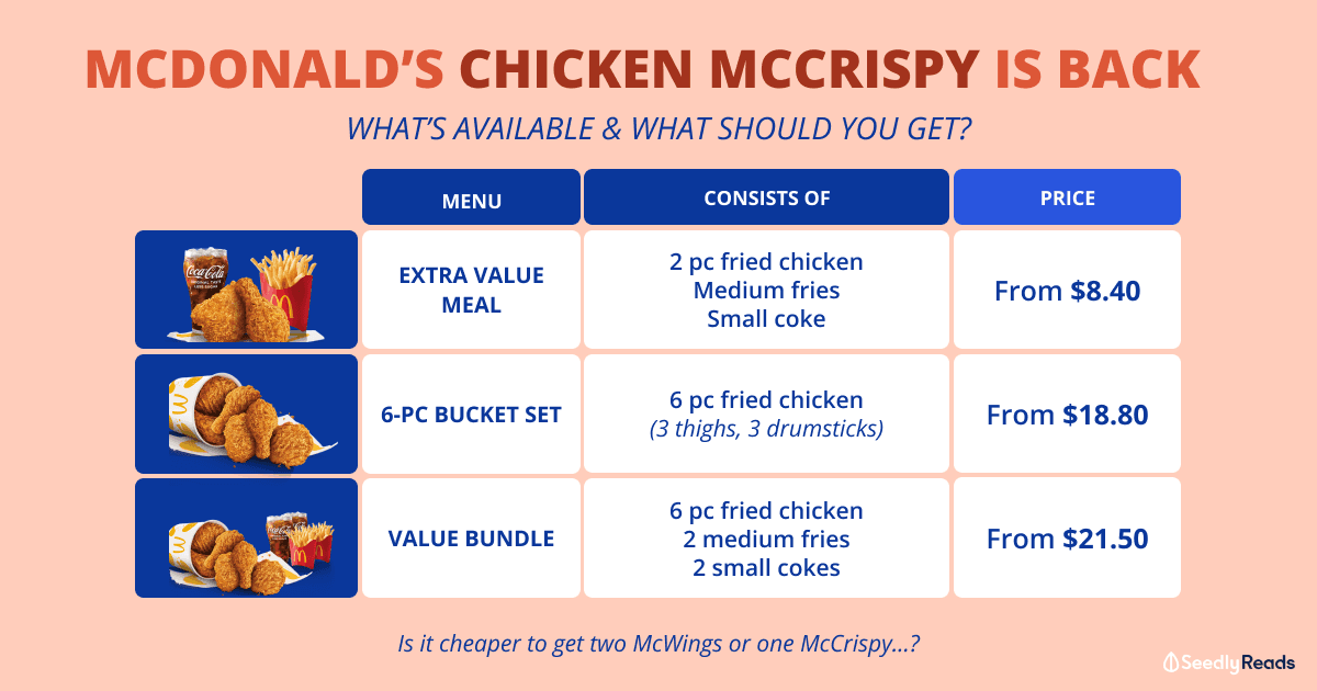 | Chicken McCrispy Value Bundle | - 6 pieces of fried chicken - 2 medium fries - 2 small cokes | From $21.50 |