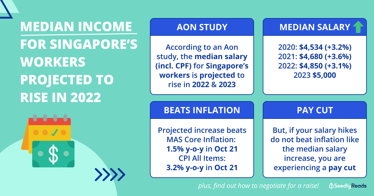 - According to the Aon study, the median salaries for workers in Singapore are projected to rise by 3.6% from $4,680 to $4,850 in 2022. This means that the median salary for Singapore workers will beat inflation.