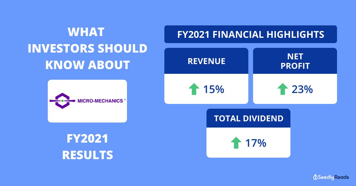 Meanwhile, Micro-Mechanics’ FY2021 net profit increased by 23.3% to a record S$18.1 million, up from S$14.7 million a year back.Â