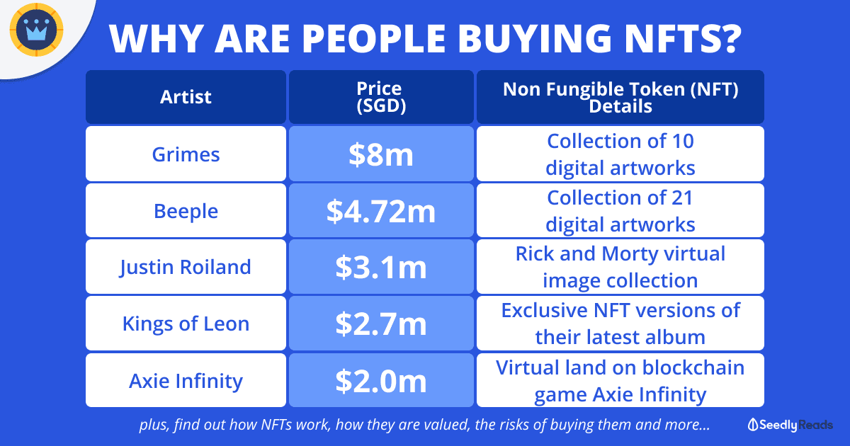 On 28 Feb 2021, artist and musician Grimes (wife of Tesla CEO Elon Musk) sold about US$6 million (S$8 million) worth of digital artworks in the form of Non Fungible Tokens (NFTs) on NFT marketplace Nifty Gateway.