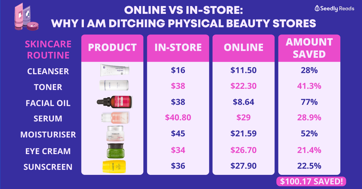 | Skincare routine | Product | In-store (SGD) | Online (SGD) | Cost Savings |