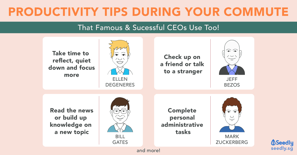We consolidated Jeff Bezos, Oprah Winfrey, Jack Dorsey, Emily Weiss, Mark Zuckerberg, Ellen Degeneres, Elon Musk, Alice Walton and Bill Gates’s tips on being productive while commuting.