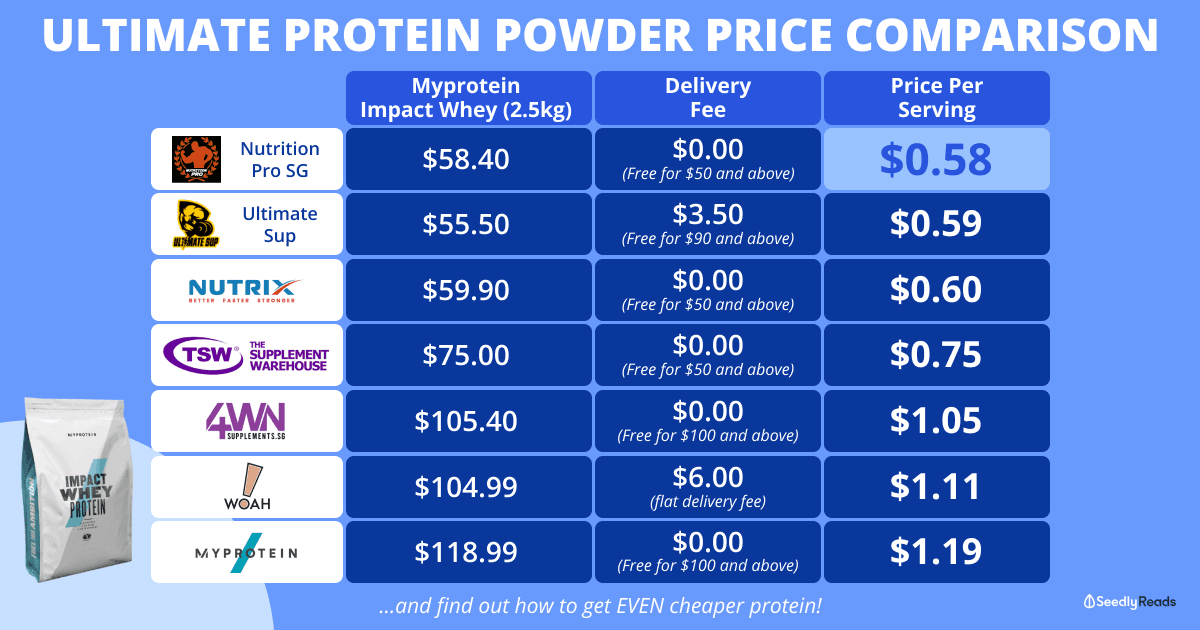 If you’re only planning to buy one 2.5kg bag of Myprotein Impact Whey Protein, the cheapest option would be Nutrition Pro SG ($0.58 per serving).