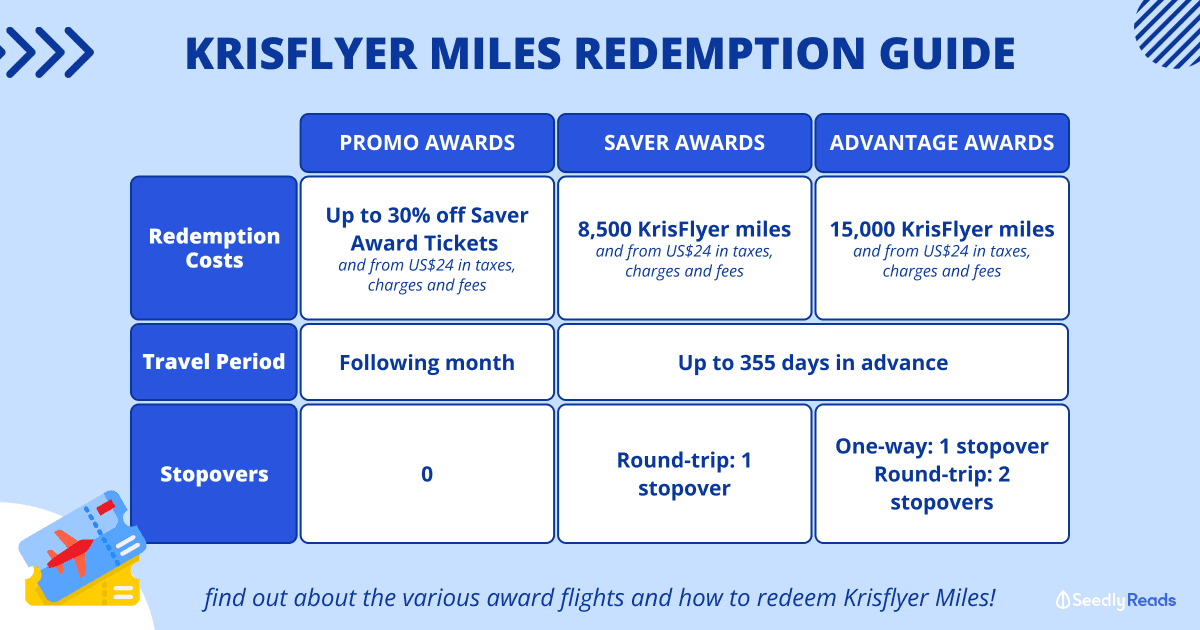| Redemption Costs | Up to 30% off Saver Award Tickets and from US$24 in taxes, charges and fees | 8,500 KrisFlyer miles, and from US$24 in taxes, charges and fees | 15,000 KrisFlyer miles, and from US$24 in taxes, charges and fees |