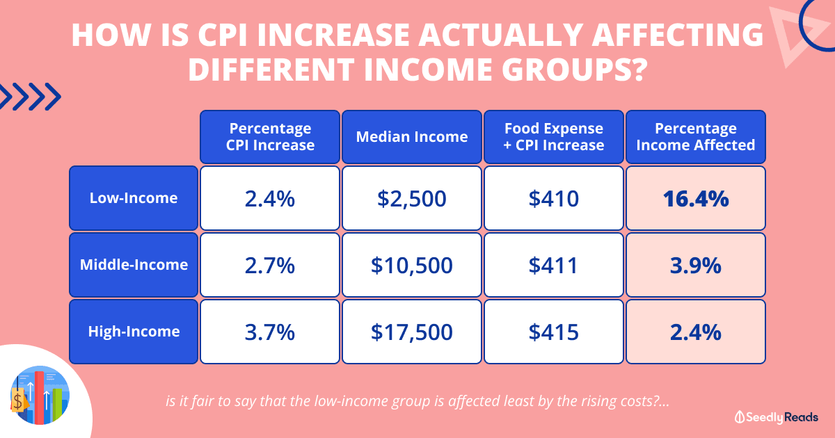 At first glance, it may seem like the low-income group is affected less by the CPI increase based on the percentages.