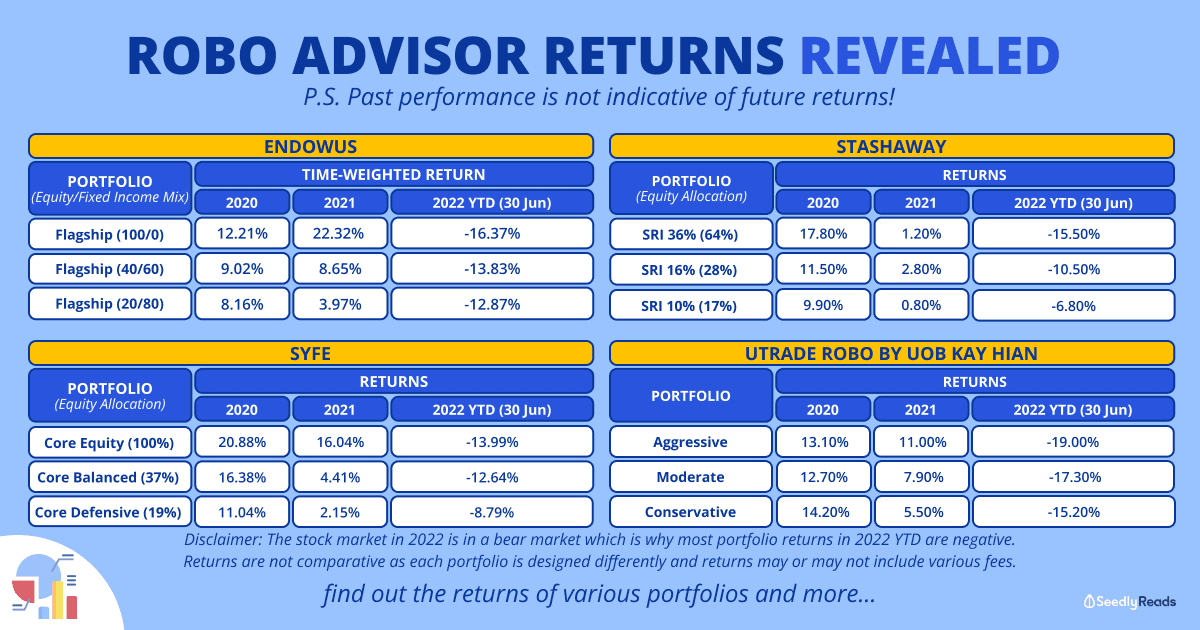 Once again, these returns data are given directly by the robo advisors and digital wealth management services themselves. If you are interested, you may also check out a “Robo-war experiment” opinion piece by one of our Seedly Community members to give you further insights about the performance of some robo advisor portfolios.