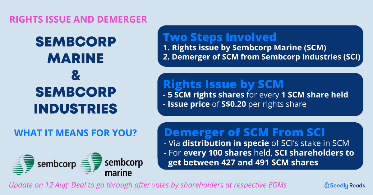 - Two parts involved — first a renounceable rights issue by Sembcorp Marine and then a demerger of Sembcorp Marine from Sembcorp Industries.