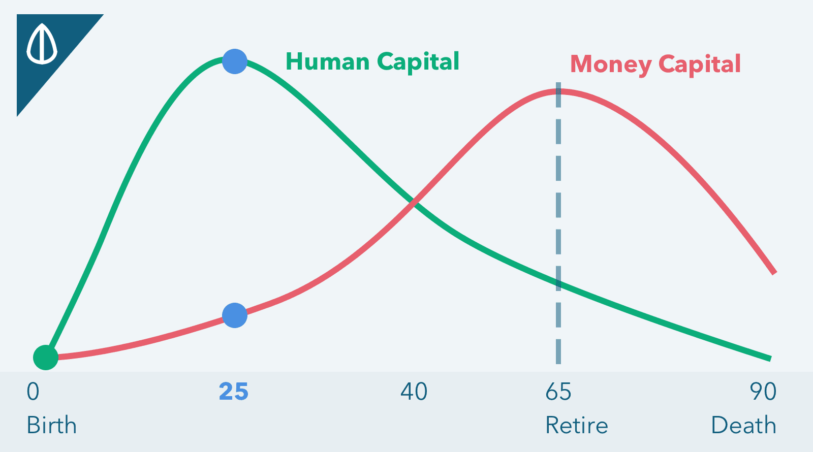 In your 20s, very often it is the stage whereby you transition from school to work life. You start to increase and build up earning power and your human capital (energy, connections). Your actual money capital may not be the highest as you are just starting out with little to no savings and potentially some form of student debt.