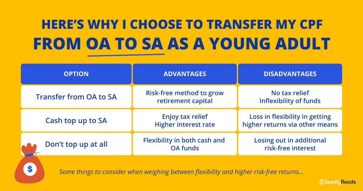 | Top Up SA with cash | Higher risk-free interest rate as compared to money in the bank Enjoy tax relief of up to $7,000 a year | Loss in flexibility of cash Loss in possibility of growing money with higher rate of return |