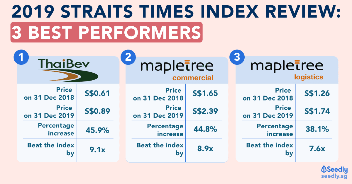 Mapletree Commercial Trust (SGX: N2IU) slots into the second spot with a unit price growth of 44.8%Â in 2019 to S$2.39. This real estate investment trust (REIT)Â is a newcomer to the index after replacing Hutchison Port Holdings Limited (SGX: NS8U) in September 2019.