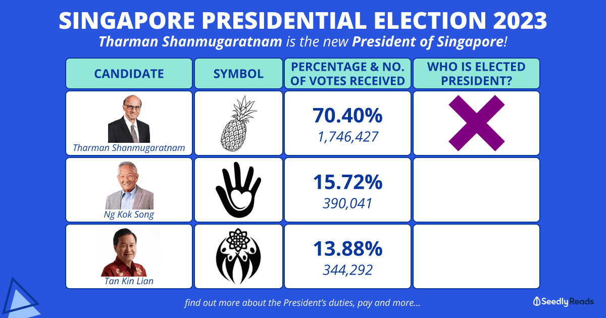 The Elections Department of Singapore (ELD) has announced that with 70.40% (1,746,427) of the valid votes, former Senior Minister Tharman Shanmugaratnam is now the President of Singapore!