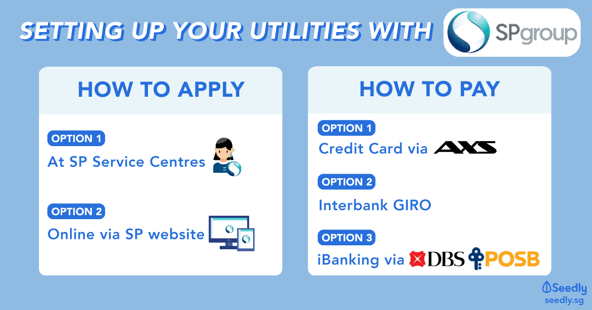 The first way is doing it over the counter at the SP Group Customer Service Centre at Manulife Tower or HDB Hub.