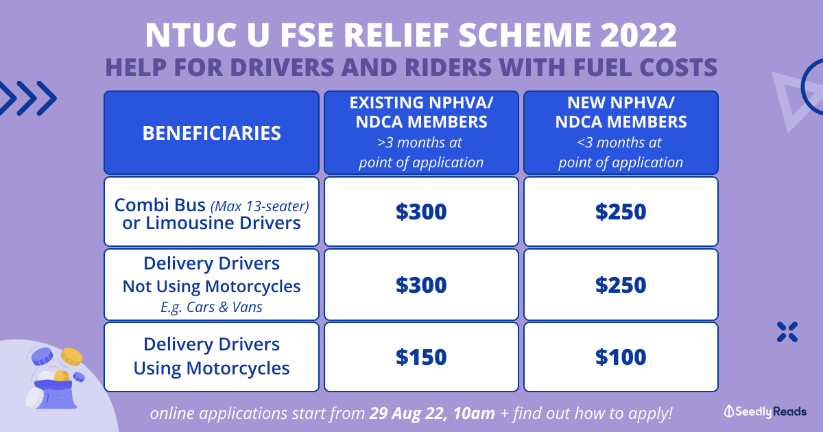 This group of drivers can receive their payouts by applying under the NTUC Freelancers and Self-Employed Unit (U FSE) Relief Scheme from 29 August 2022 to 28 October 2022.