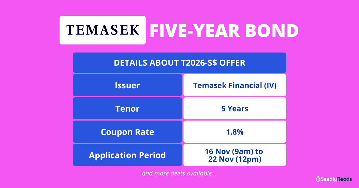 Temasek, one of three investment entities in Singapore, is offering the T2026-S$ Temasek bond, a five-year Singapore dollar bond that gives a coupon rate of 1.8% per annum.