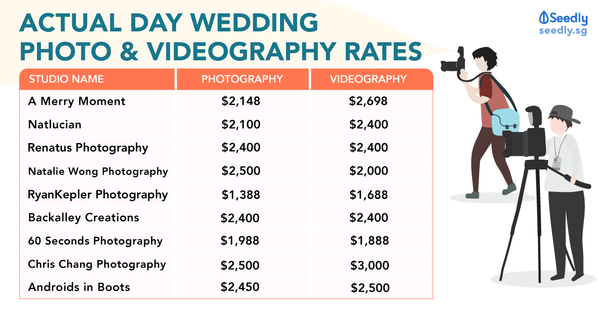 Here’s a list of actual day wedding photography and videography vendors and studios with their rates for a full-day wedding day shoot.