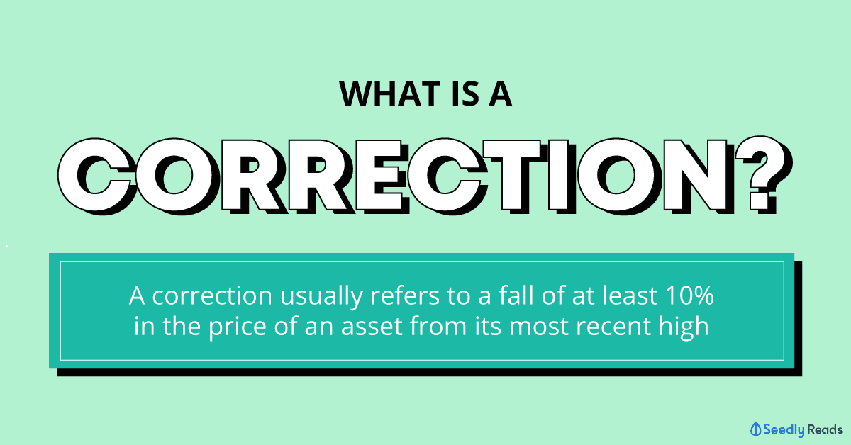 A correction usually refers to a fall of at least 10% in the price of a stock (or stock market) from its most recent high.