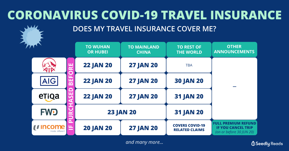 | AIG | Covers if policy purchased before 22 Jan 2020, 12:01 am | No coverage for policies issued after 27 Jan 2020, 12:01 am | Covers if policy bought before 30 Jan 2020, 12:01 am (subject to assessment) | - |